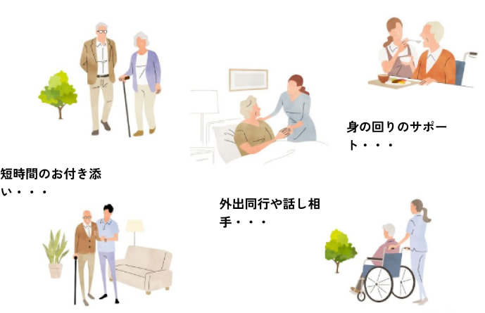 見守り、家事代行、食事介助、入浴介助、トイレ介助、服薬確認、長時間の外出同行、 旅行付き添い、通院同行、入院時の見守り、24時間見守り介護等ご対応致します。
